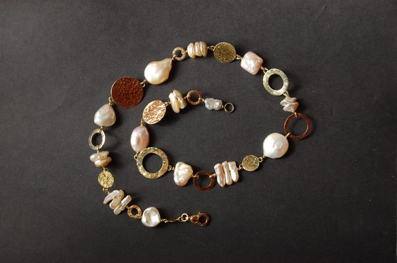 girocollo in oro giallo 750/1000 martellato a mano, con perle scaramazze di acqua dolce