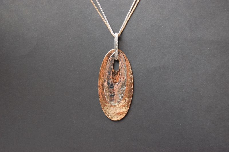 pendente in oro bianco e rosso 750/1000 martellato a mano, con piccoli diamanti
